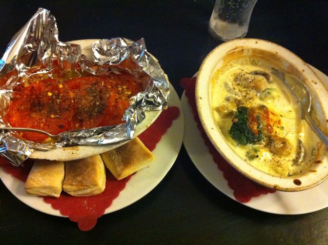 Jeśli chodzi o klu czyli jedzenie to z perspektywy 15 lat oceniam, że trzyma poziom. Karta zmieniła się kosmetycznie. Zupa cytrynowa wspięła się na wyższy poziom kwasowości, co osobiście uważam za błąd, bo ta dawna, delikatniejsza, bardziej mi smakowała. Musaka zyskała grubszą warstwę kartofli, co też nieco dziwi, gdyż w oryginalnym przepisie nie ma kartofli i taką bezkartoflową jadłam w wielu miejscach na Korfu. Mimo wszystko sądzę, że Grecy wiedzą więcej o kuchni greckiej niż Magda Gessler, nawet ci z Korfu, uważanej za bardziej włoską niż grecką wyspę. Na przystawki zamówiliśmy fetę z pieca (to to czerwone danie, na fecie leżą zgrilowane pomidory, stąd kolor) oraz warzywa al forno (brokuły i pieczarki, bez których mogłabym się obejść, podobnie jak bez kartofli z musace)