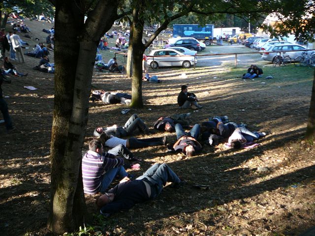 Niestety z biegiem lat dostanie się do namiotu zaczyna graniczyć z cudem. Bramkarze działają bowiem według niemieckiej reguły akuratności i jeśli mają powiedziane, że liczba osób w hali ma być constans, nie wychylą się ani o jednostkę. Z braku środków nigdy nie sprawdziłam tego na własnej skórze, ale jestem gotowa założyć się, że jeśli nawet będziemy kusić łapówką w wysokości grubych plików euro, bramkarz się nie złamie. Przepis jest przepis i dyskusji na ten temat nie przewiduje się. Jeśli więc nie mamy zarezerwowanego miejsca w hali, możemy ewentualnie pojeździć na karuzeli. Albo poczekać do dziesiątej wieczorem, czyli pory, gdy najwięcej osób opuszcza halę, w związku z tym bramkarz, połączony krótkolafówką z kumplami wewnątrz, więcej osób wpuści.