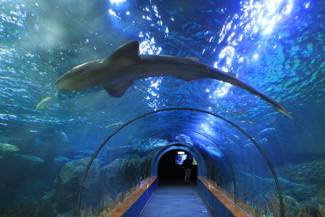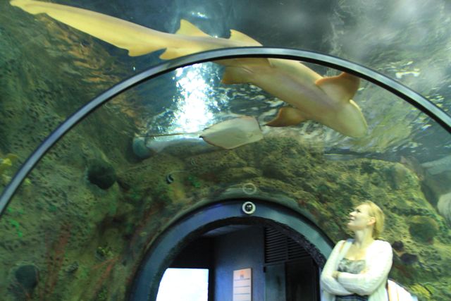 Loro Park chwali się najdłuższym na świecie tunelem podwodnym, dzięki któremu można oglądać rekiny i inne morskie zwierzęta od strony podbrzusza. Kłopot w tym, że rekiny i płaszczki już się wycwaniły, obcykały, gdzie głębiej, gdzie płycej, wpływają na płyciznę nad głowami zwiedzających i zwyczajnie leserują. Na poniższym zdjęciu ja w towarzystwie rekina, który najwyraźniej zapadł w drzemkę na płyciźnie, a dalej cały tunel