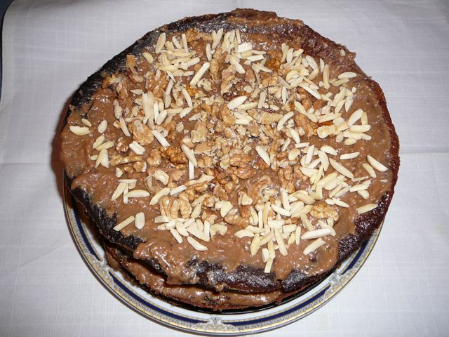 Podzielić biszkopt na 3 części (Perfekcyjna Pani Domu radzi, żeby to zrobić za pomocą nitki dentystycznej). Każdy blat posmarować kremem. Spróbować to wszystko zestawić do kupy. Zapadnięty wierzch posypać dużą ilością orzechów i migdałów, żeby nie biło po oczach, że zapadnięty. Za pomocą przekupstwa, pogróżek oraz szantażu skłonić rodzinę do zachwytów. Odstawić tort do lodówki, a rodzinę, jeśli będzie oporna, wystawić za drzwi, na mróz, żeby skruszała.