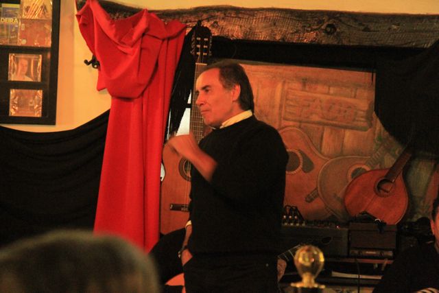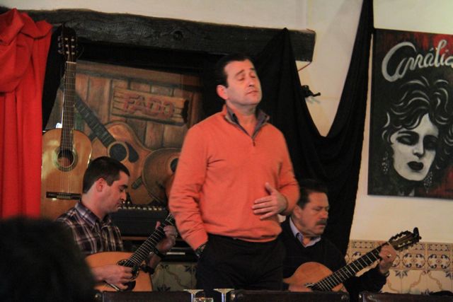 Muzyka na żywo zaczyna się o 19.30. Fado okazało się bardzo forsownym rodzajem śpiewu, zahaczającym wręcz o umiejętności wymagane przy ariach operetkowych, więc śpiewaków było co najmniej trzech na wieczór. Zdecydowanie rządził pan w sweterku, który naprawdę potrafił dać czadu.