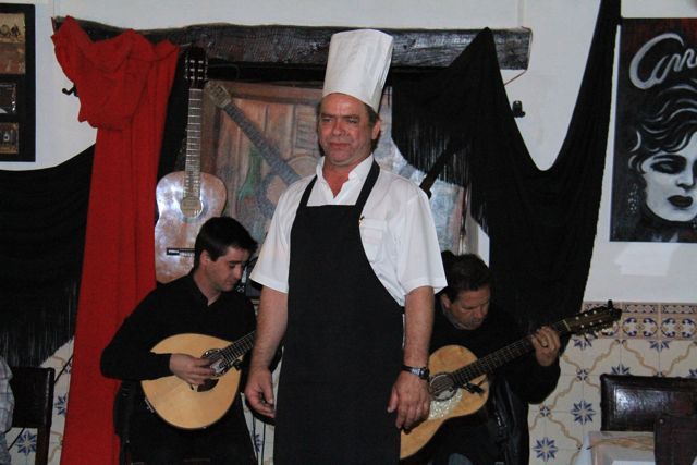 Wraz z rozwojem uroczego wieczoru, dołączały do niego inne głosy. Jako pierwszy, miłym barytonem, włączył się w refren kucharz, pilnujący grilla przy wejściu, gdzie piekły się nasze szpady z kalmarem. Po chwili rozległy się głosy z kuchni po drugiej stronie sali. Kolejną zwrotkę pociągnęła kelnerka i zapewniam, że nie było w tym nic z chałupniczego talentu obsługi polskich Restauracji  Spiewających Kelnerów (wiem, bo skatowano nas tam kiedyś Windą do nieba). Niestety gorące zachęty śpiewaków, byśmy włączyli się do chóru, zakończyły się niepowodzeniem, bo moja znajomość języka zaczyna się i kończy na “talerzu byków”. Więc tylko tupaliśmy, starając się w rytmie.
