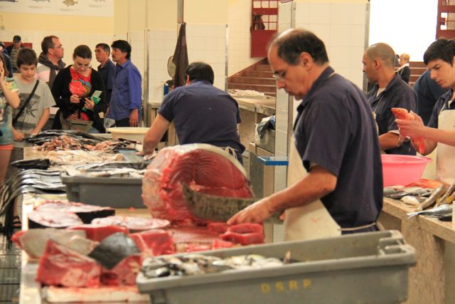 Z wyglądu, wstyd się przyznać, rozpoznałam tylko tuńczyka. To ten największy. Nie jestem niestety taką znawczynią, za jaką pragnęłabym uchodzić. W związku z tym wieczorny wybór z karty stanowił niejaki problem. W restauracjach w Funchal dominują szaszłyki, które tu nazywają szpadami. Kompozycja zależy od kucharza. Tuńczyk jest prawie zawsze obecny, tylko ma różne towarzystwo. Może występować z gigantycznymi krewetkami, kalmarem, boczkiem albo z innymi rybami. Niektóre są tak delikatne, że nie sprawdzają się na szpadzie, dorada czy ryba papuzia występują indywidualnie, jako filet podany samopas na talerzu.